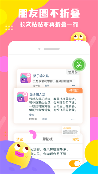 茄子输入法是款好用手机输入法工具app。替换手机默认的功能少、内存大的普通输入法,拥有在聊天吐槽、营销推广等日常便利工具,内置海量表情包素材,打字与发表情两不误,朋友圈永不折叠,感兴趣的用户不要错过哦!